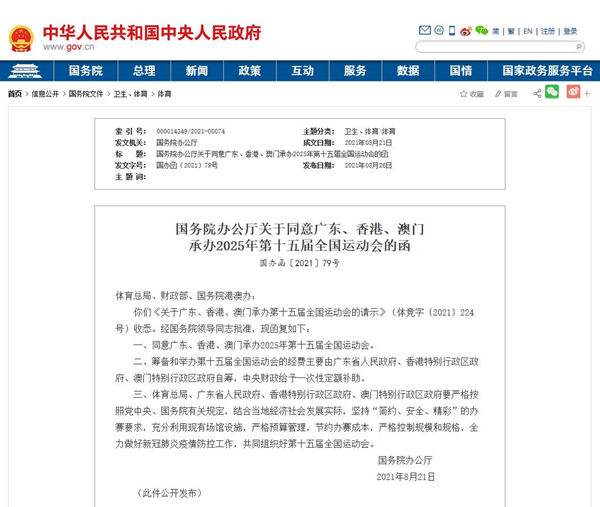 你們《關(guān)于廣東、香港、澳門承辦第十五屆全國(guó)運(yùn)動(dòng)會(huì)的請(qǐng)示》(體競(jìng)字〔2021〕224號(hào))收悉。經(jīng)國(guó)務(wù)院領(lǐng)導(dǎo)同志批準(zhǔn),現(xiàn)函復(fù)如下: