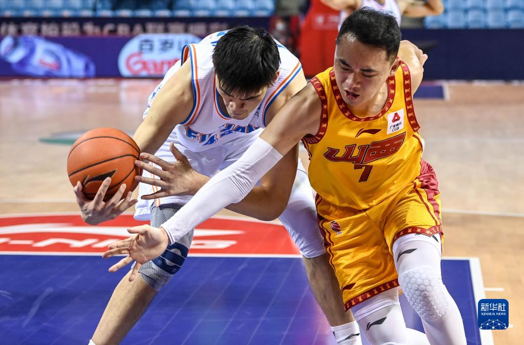 1月10日,山西汾酒股份隊球員原帥(右)與福建潯興股份隊球員孫喆在比賽中爭搶。